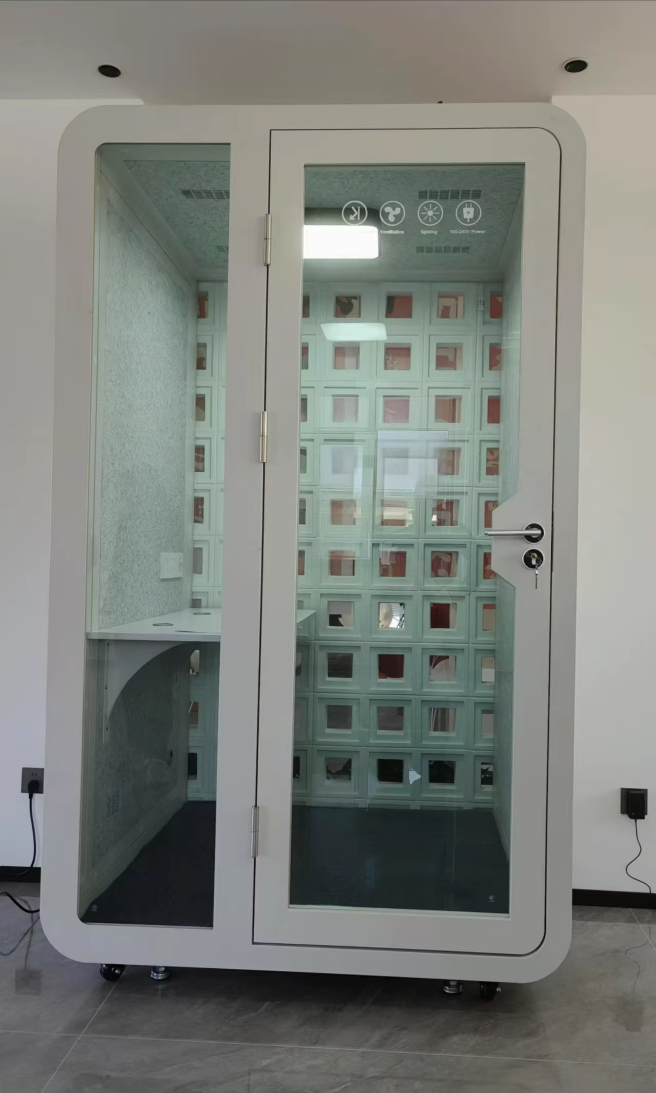 • 内部吸音: 密度 60kg/$m^3$ のポリエステル繊維吸音パネル(リサイクル可能素材)を全壁面に配置。内部での反響音を抑え、Web会議での音声クリア度を劇的に高めます。