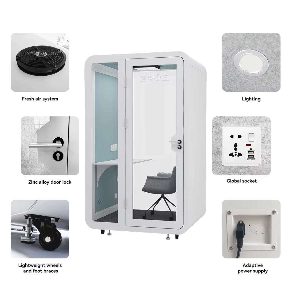 • 内部吸音システム: 壁面には密度 80kg/$m^3$ の高密度ポリエステル繊維吸音パネルを配置。音声の反響を 0.4秒以下に抑え、Web会議におけるハウリングを防ぎ、クリアな集音を実現します。